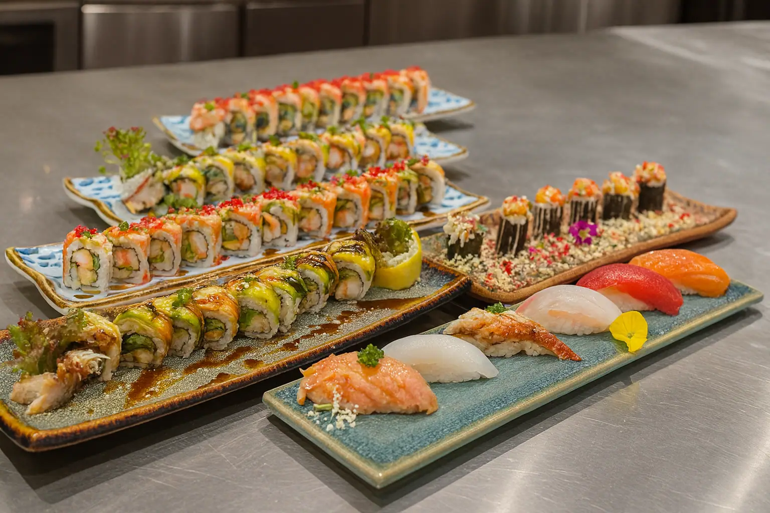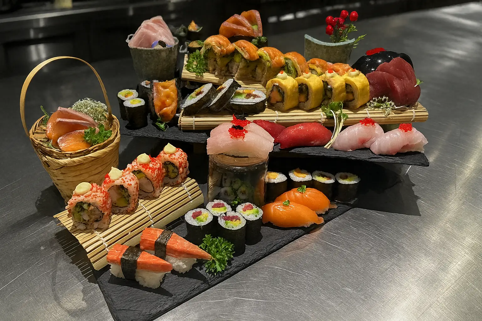 Mit Sushi als Hauptfokus, sorgfältig zubereitet und mit seinem feinen Aroma bewahrt. Neben Sushi bietet die Speisekarte mehr als hundert vielfältige asiatische Gerichte, von vertrauter chinesischer Küche. Dazu kommen verschiedene Nudel-, Reis- und leichte Gerichte. Alle Speisen werden mit großer Sorgfalt zubereitet und können auf Wunsch individuell angepasst werden