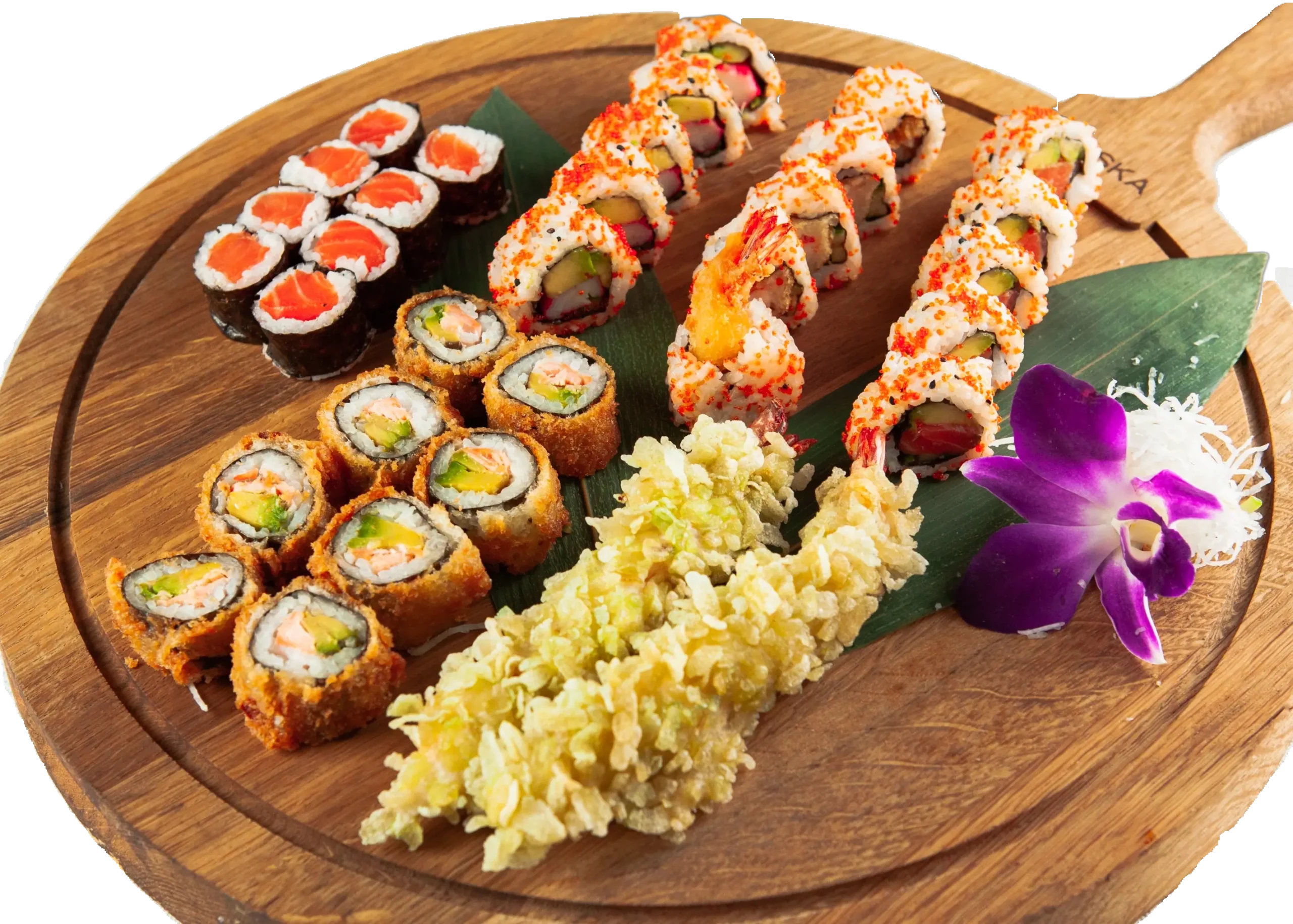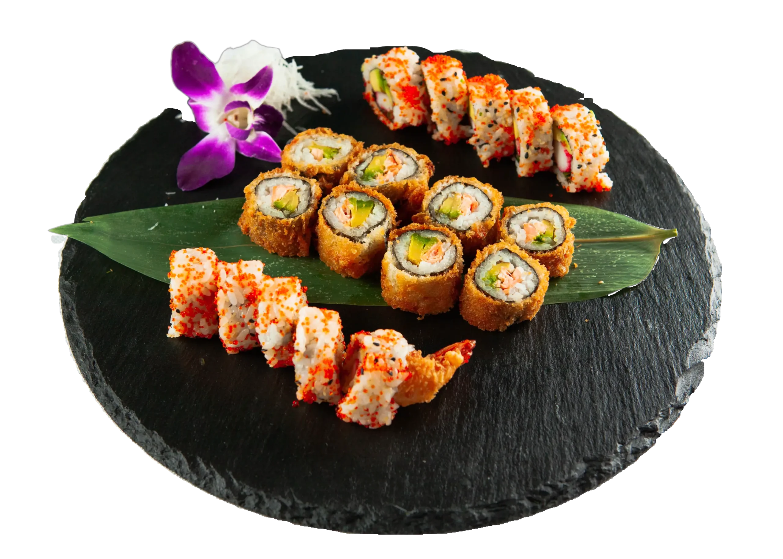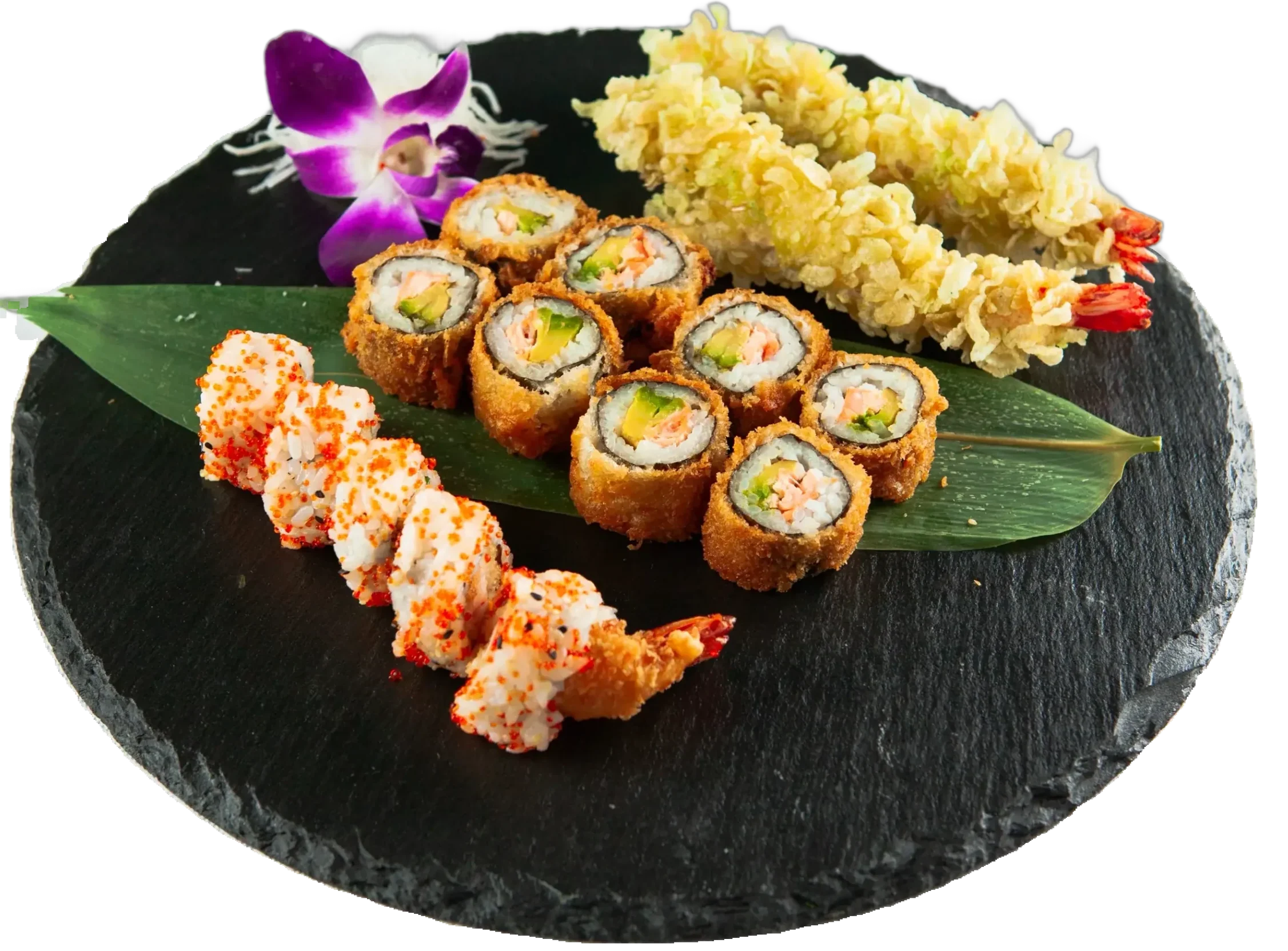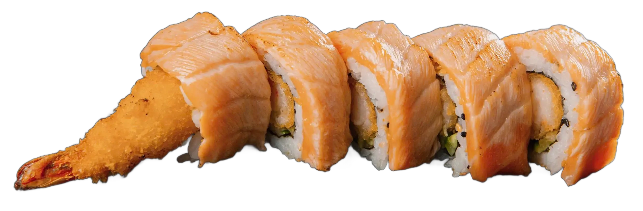 Gebackene Garnelen, Frischkäse, Mango, Avocado, ummantelt mit flambiertem Lachs, Spezialsoße, Tempura Flocken
