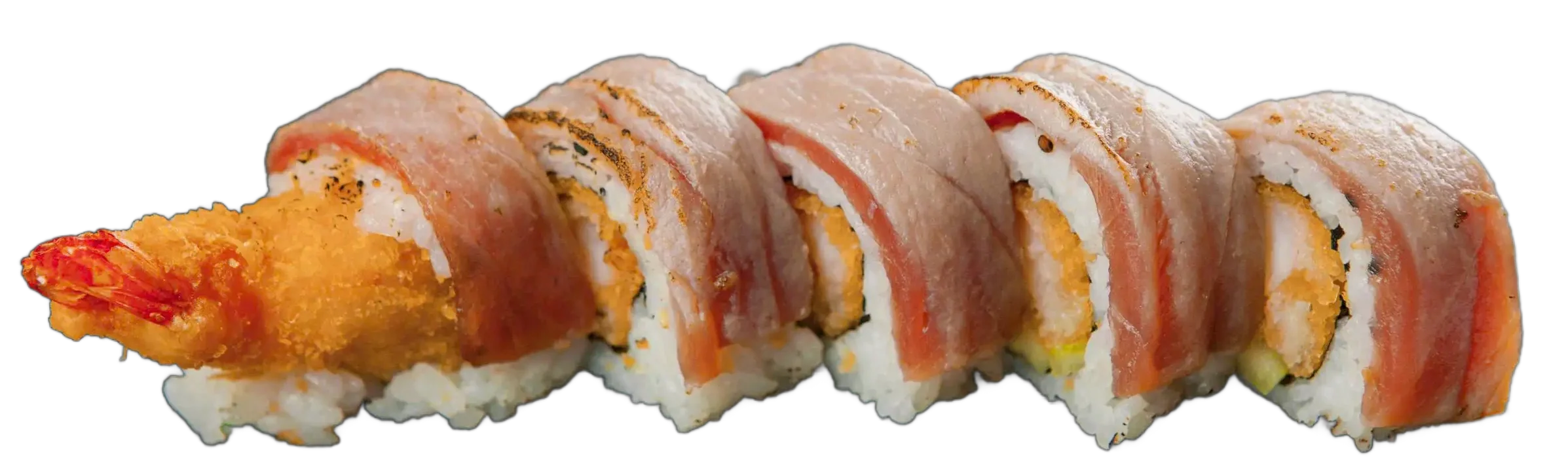 Gebackene Garnelen, Frischkäse, Mango, Avocado, ummantelt mit flambiertem Thunfisch, Spezialsoße