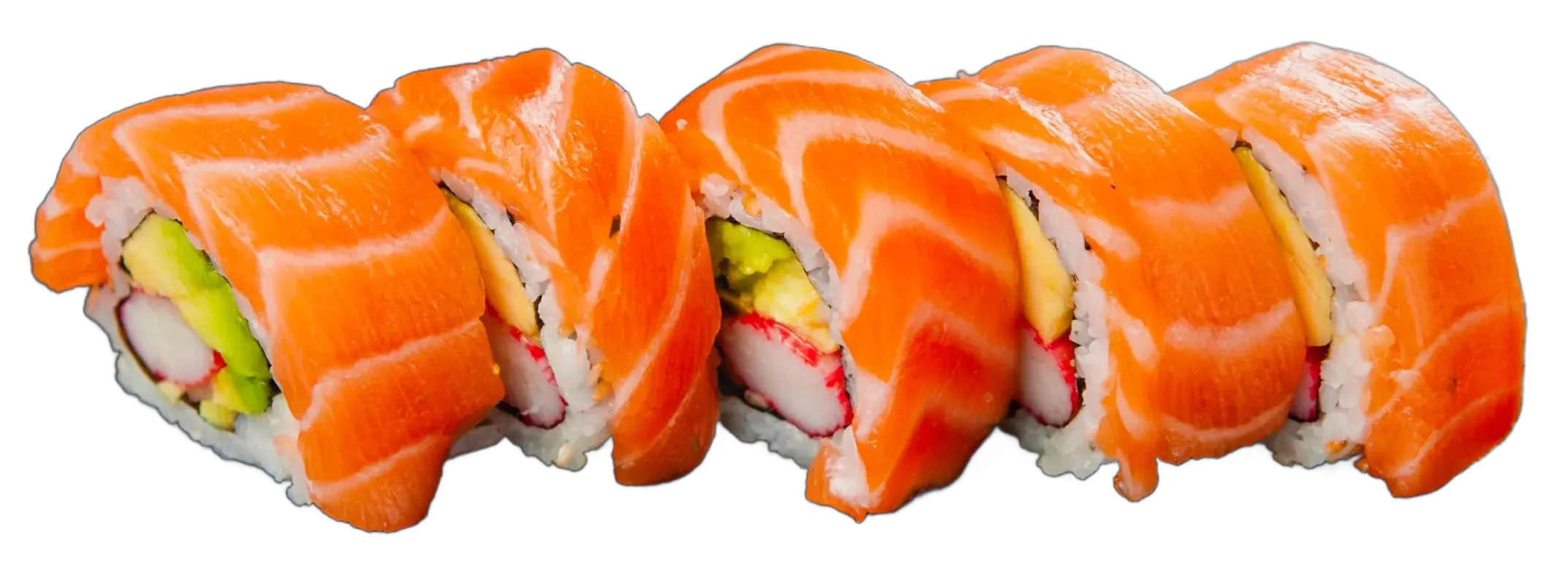 Surimi, Mango, Avocado, Frischkäse, ummantelt mit frischem Lachs, Unagi Soße