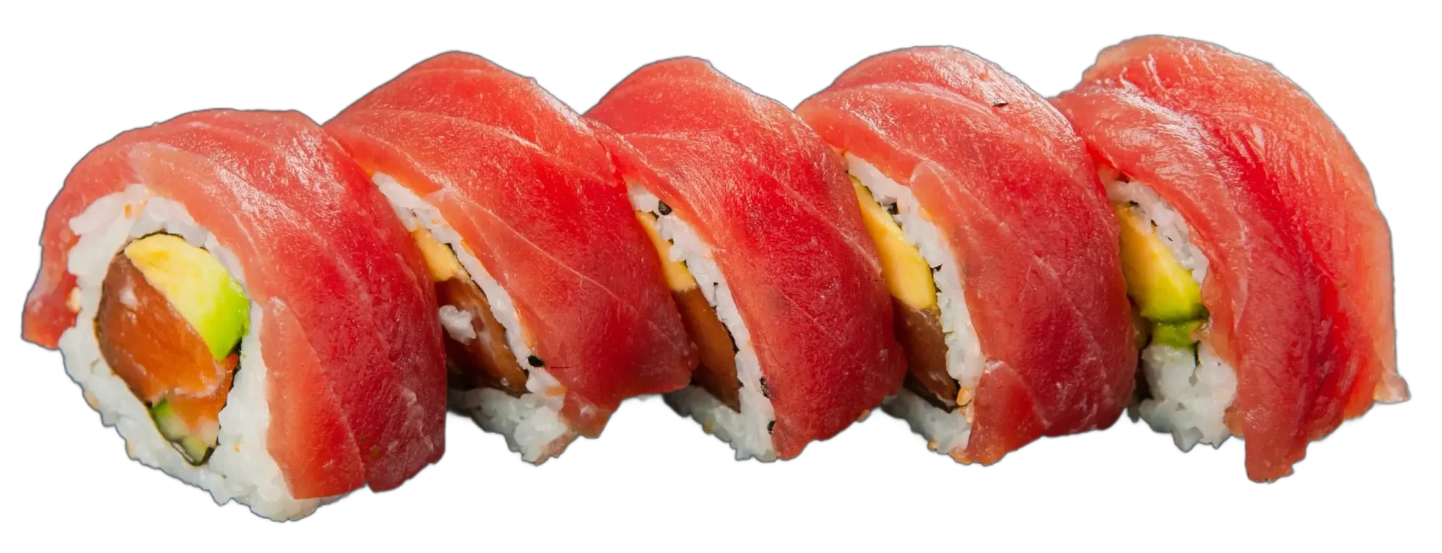 Lachs, Avocado, Mango, Frischkäse, ummantelt mit frischem Thunfisch