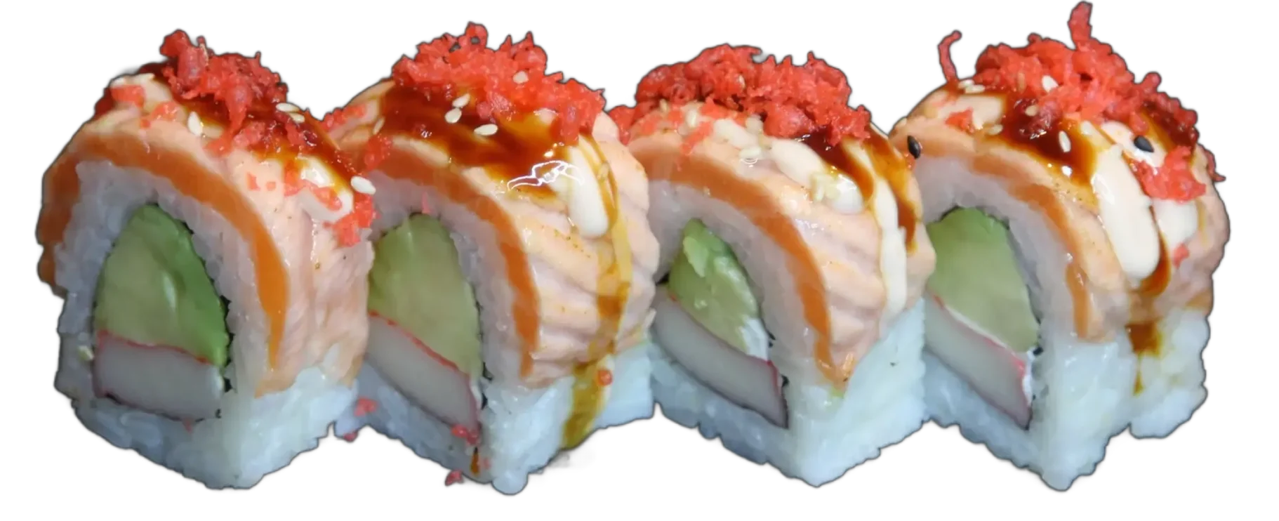 Surimi, Mango, Avocado, Frischkäse mit flambiertem Lachs spezialsoße und Tempura Flocken.