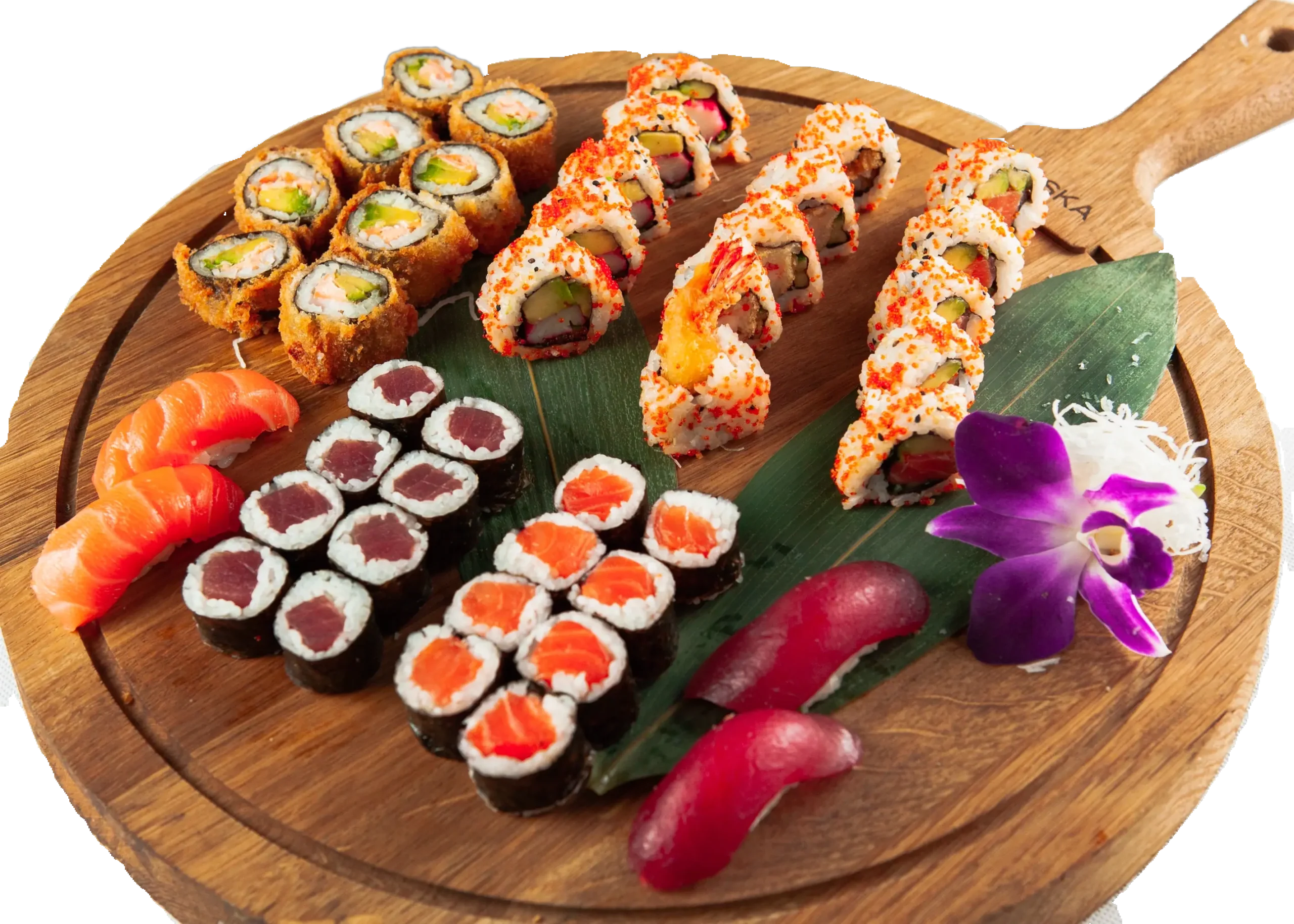 4 Nigiri (Sake, Maguro), 8 Sake Maki, 8 Tekka Maki, 8 Ebi Tempura Roll, 8 California Roll, 8 Sake I-O, 8 Gebackene Salmon, Seetangsalat